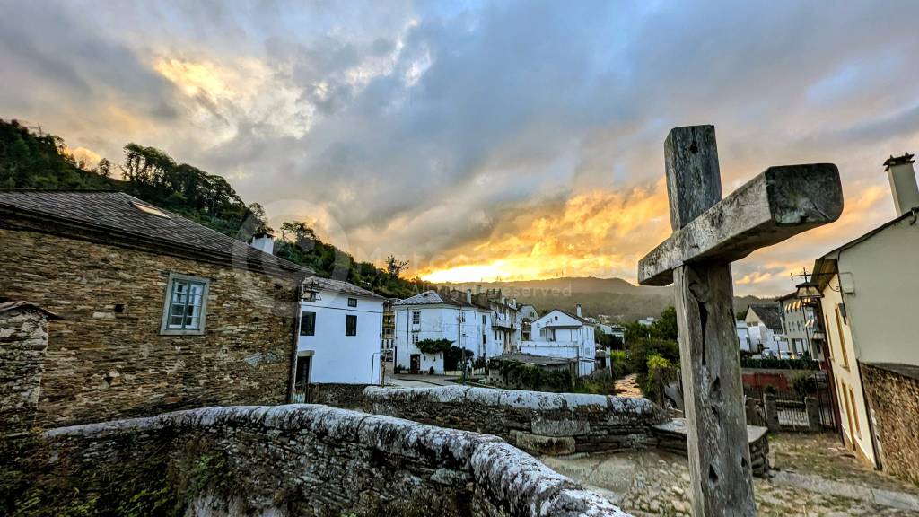 Na imaxe en primeiro plano a Ponte do Pasatempo e a cruz de madeira en recordo do Mariscal, ao fondo as casas do barrio dos Muiños, e máis ao lonxe un atardecer sobre os montes da Toxiza.