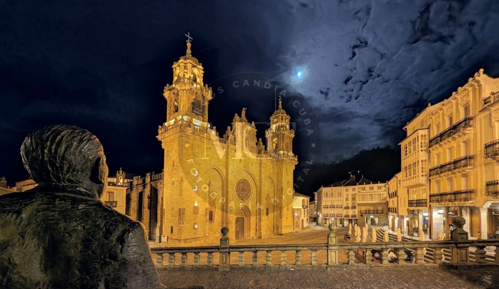 Hoxe traemos unha nova imaxe da Praza da Catedral, unha noctura coa lúa como testigo de excepción, pero tamén, con Cunqueiro, xa que a imaxe de hoxe, achega a perspectiva do histórico escritor mindoniense sobre a Catedral, a Praza, os Cantos, e ao fondo o seu nomeado Bosque de Silva. Unha imaxe semellante, inda que dende o outro perfil do escritor era a que traiamos nesta outra entrada da web, daquela con luz diurna.