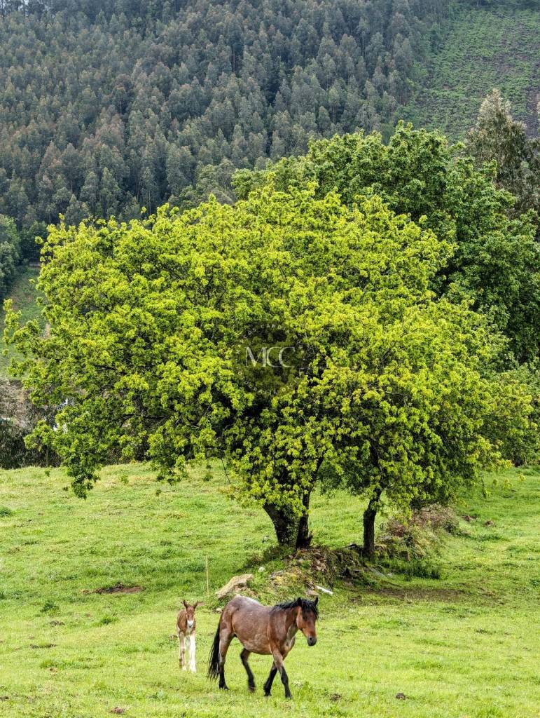Fai uns días puiden captar esta imaxe na que flora e fauna forman un. Mezcla de cores e vida. Ao fondo eucalitpos, a nova «árbore autóctona», e máis cerca do plano carballos e castiñeiros, un verde prado, e sobre el, unha euga coa súa cría.