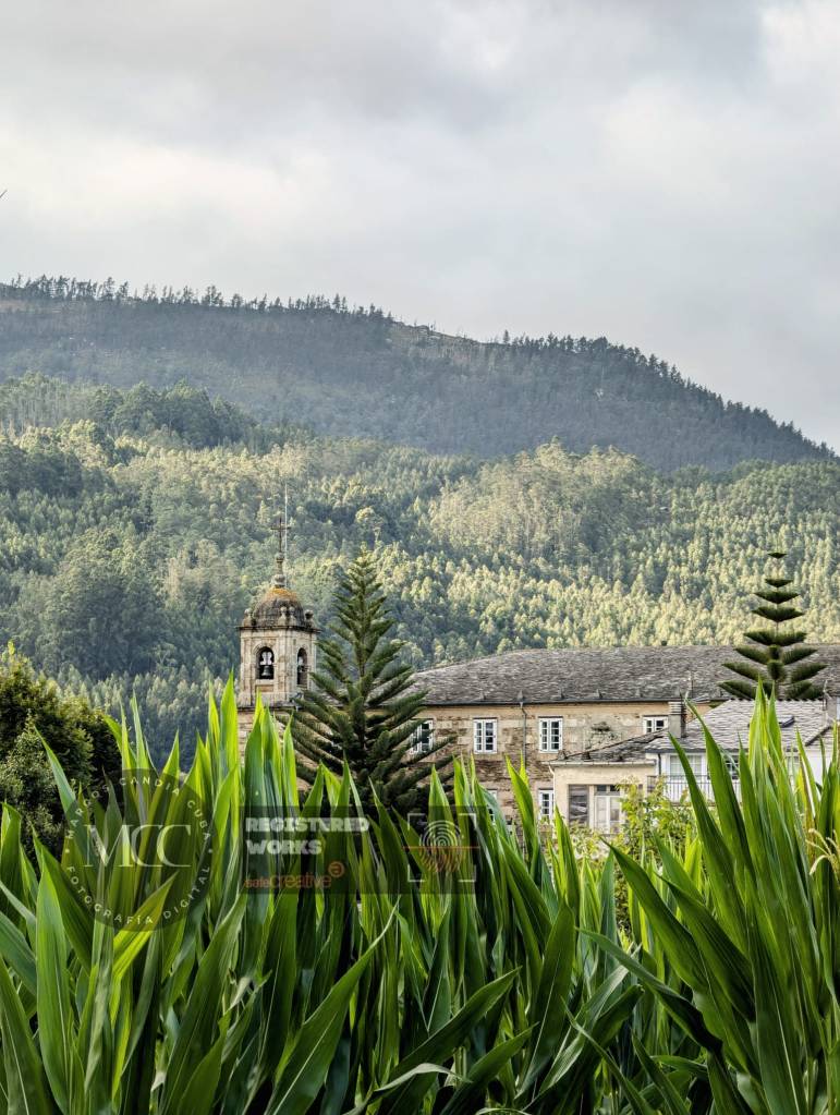 Na imaxe de hoxe un simbiose de natureza e arte. Por un lado os bosques que podemos ver na loma de Valiño e ao fondo a Toxiza; en primeiro plano un terra de esbelto millo, e no medio entre toda a natureza, asoma a torre das campás do hospital San Pablo e San Lázaro na Alameda dos Remedios.