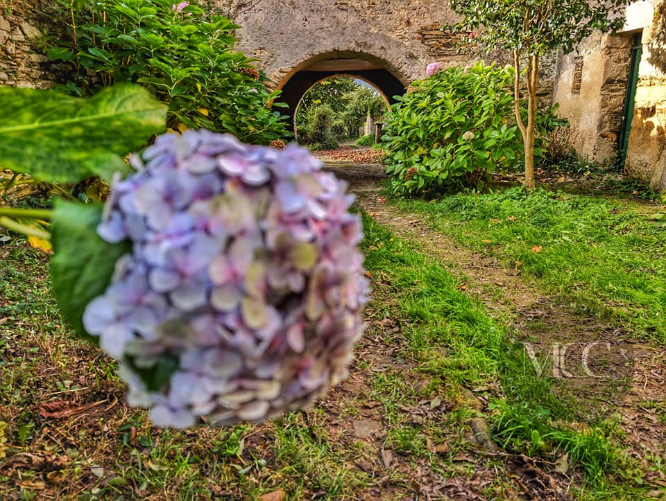 Na imaxe podemos ver unha flor en primeiro plano que loce no xusto ao carón do pazo, que atisbamos na parte dereita, ou no fondo da imaxe, onde nese pasadizo, a esquerda teremos o acceso a capela, e a dereita outra entrada ao pazo.