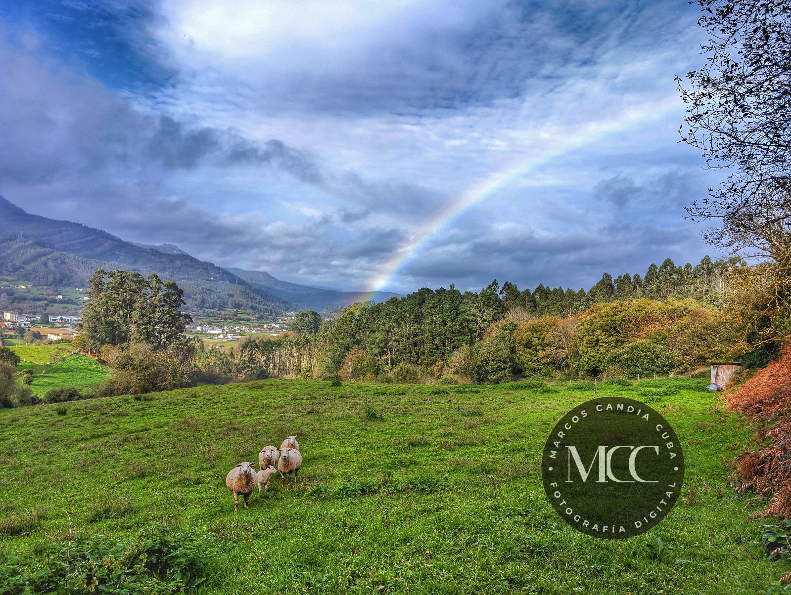 Días de chuvascos que se mezclan con sol, en Mondoñedo, temos a moreas. Deste xeito un fenómeno habitual no val é o Arco da Vella. Na imaxe de hoxe un captado baixando de Abidueiras a Mondoñedo, apuntando o obxetivo da cámara ao Norte. Podemos ver o fondo algunhas das vivendas da zona de San Lázaro en primeiro plano e o Coto da Recadieira máis ao fondo.