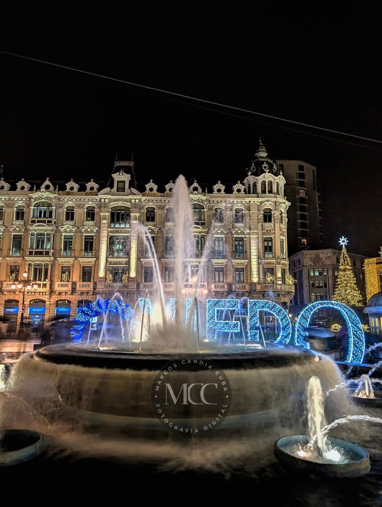 Seguimos en Asturias, hoxe na súa capital, Oviedo, concretamente na praza de «La Escandalera», a que se enche de cor durante estas datas de nadal. Entre outros detalles unhas fermosas letras co nome da capital de Asturias, nunha lustrosa cor azul, brilan con luz propia nesta praza.