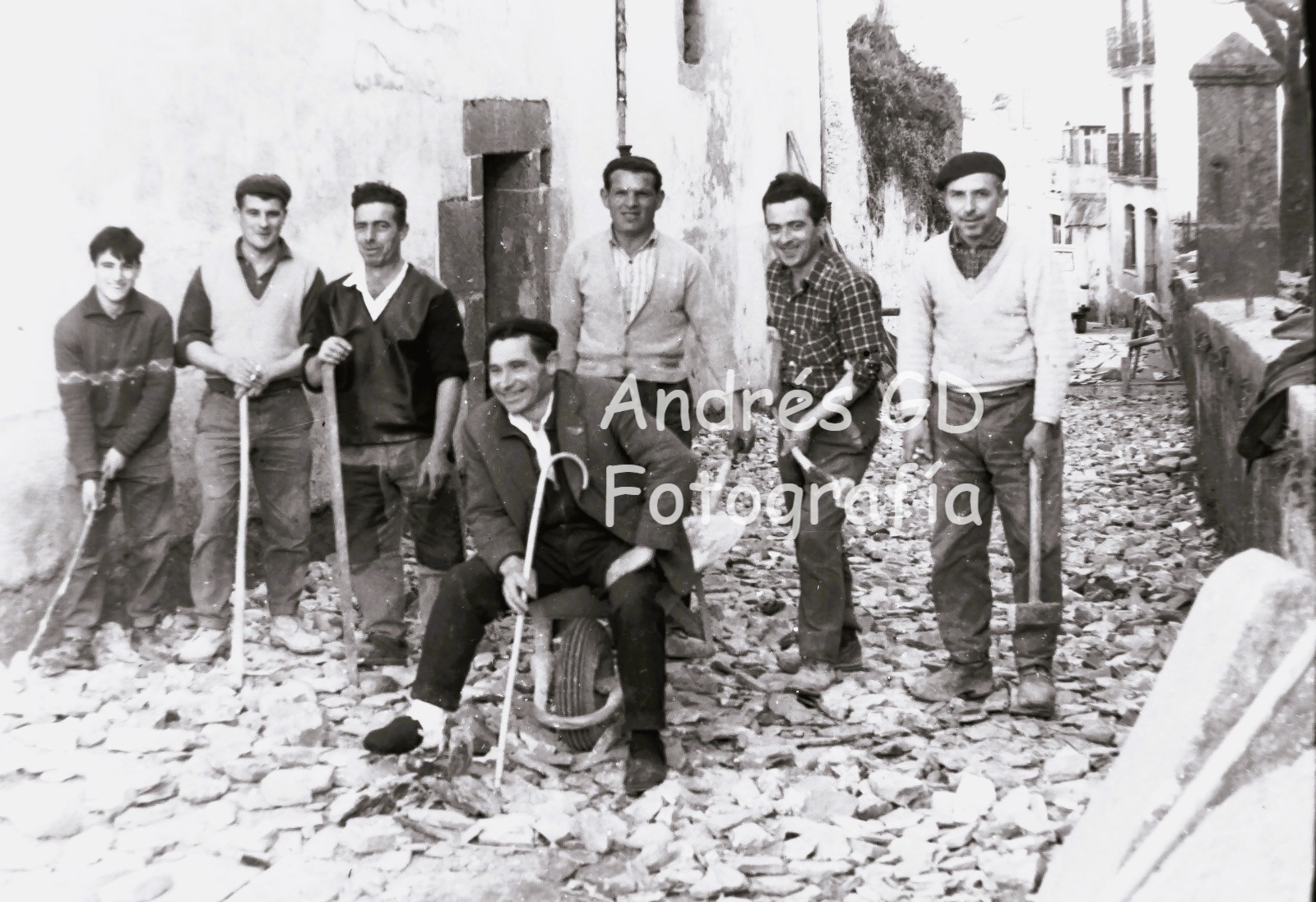Vemos na foto de esquerda a dereita: Pascasio Anello, Feliciano García, Alberto Cabanas, Justo Anello, Alfredo Rodríguez, José Otero e José Rubal Vieiro (sentado na carretilla).