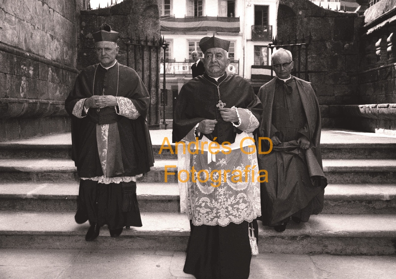No centro da imaxe atopamos a D. Fernando Quiroga Palacios, arzobispo de Santiago de Compostela. D. Fernando nado en Maceda (Ourense), no 1900 e bispo da nosa cidade entre os anos 1945 e 1949. No 1949 sería nomeado arzobispo de Santiago de Compostela. D. Fernando foi o primeiro presidente da Conferencia Episcopal Española. Faleceu en Santiago no ano 1971.