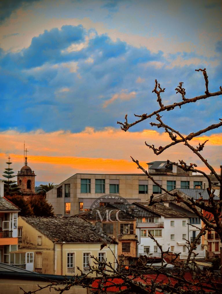 Atardecer sobre Mondoñedo, co protagonismo do ambulatorio e da torre do Hospital San Pablo e San Lázaro, na Alameda dos Remedios.